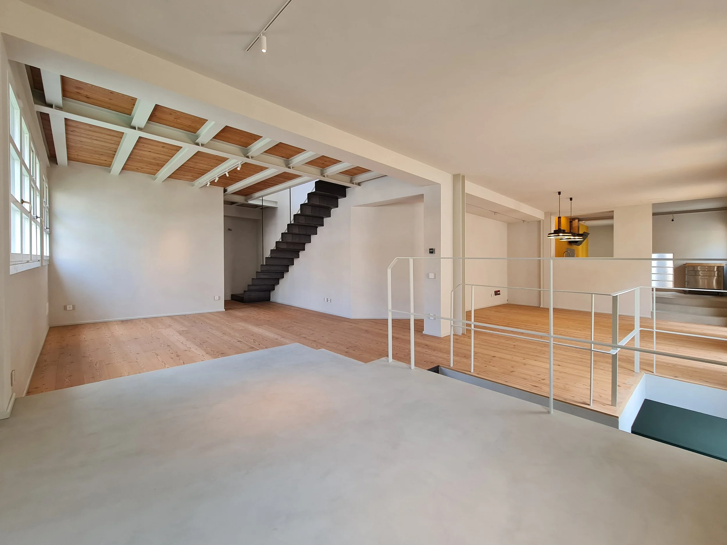 The luck of coming across an industrial warehouse to renovate in a small historic center was clear to me from the beginning. Due to their morphology of birth, this type of architecture has always exercised a particular fascination on me; possibility of creating large spaces without distorting the origin and the possibility of playing with open-space environments. Already in the 1970s this building had been transformed into an apartment, unfortunately with many internal divisions. With the current owner, the peculiarities of the building and the possibility of exploiting the construction structure in favor of large spaces were immediately sought. The apartment is spread over 3 levels, accompanied by two terraces and a beautiful and rare green roof. The characteristic openings, the windows, also allow you to have very bright spaces. On the ground floor, previously used as a warehouse and now used as an entrance with a gym area and Turkish bath, it was crucial to recover the opening of the two large pre-existing skylights which brighten up a space that had previously been narrow. The two staircases connecting the floors were made of metal, self-supporting, a choice dictated by the desire to integrate elements of industrial taste, just as the texture of the new floor in stringers was left exposed although painted. The colors used are predominantly light greys, the shades are still warm and bright and create a soft contrast with the floors; Pastellone was chosen for the ground floor while light heat-treated planking was used for the subsequent floors.